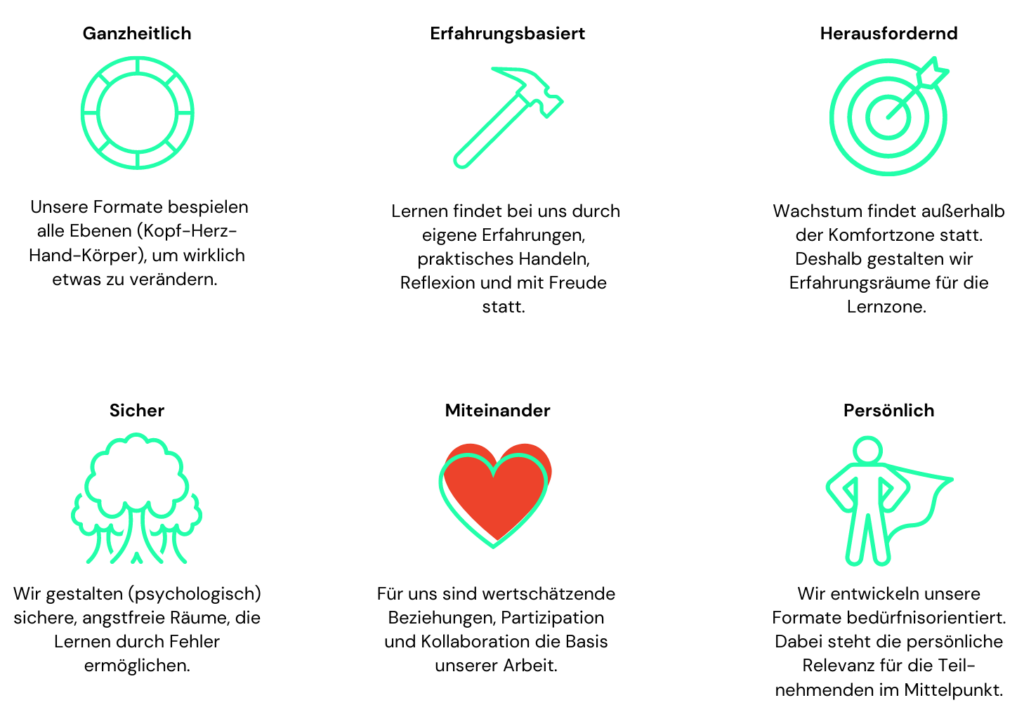 Dafür bauen wir auf die Stärke von Kooperation und Gemeinschaft auf Augenhöhe. Zusammen mit jungen Menschen, Pädagogen und Pädagoginnen, Organisationen aus der Wirtschaft und Zivilgesellschaft entwickeln wir auf Wirkung ausgerichtete Formate und Programme, die die Bedürfnisse und Potenziale junger Menschen in den Mittelpunkt stellen.